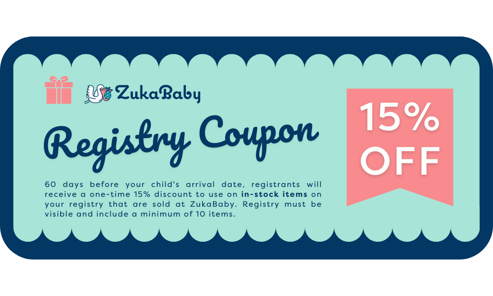 If your registry is visible and includes a minimum of 10 ZukaBaby items, you will be eligible for your registry completion coupon. 60 days before your child's arrival date, ZukaBaby registrants will receive a one-time 15% discount on in-stock items listed on your registry that are sold at ZukaBaby.