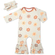 Ridiculously cute! Outfit your little lady for a day of fun and fashion in this cozy-soft, knit jersey romper with a modern floral print and 2 tiers of oversized ruffles at the ankles! A snap inseam and lap collar make dressing easy, while a matching adjustable headwrap completes the look!