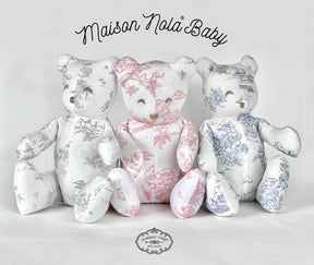 This sweet little stuffed bear features the 100% Cotton Storyland Toile print. No two bears are alike. He’s approx. 9” high. Stuffed soft so they are perfect for cuddling!