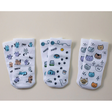 - Silicone grips with size callouts on the bottom of sizes 6-12, 12-24, and 2T-3T help prevent slips and falls
