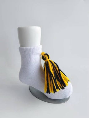 The cutest little tassel socks for your baby majorette with black and gold tassel attached. All socks have gripper bottoms.