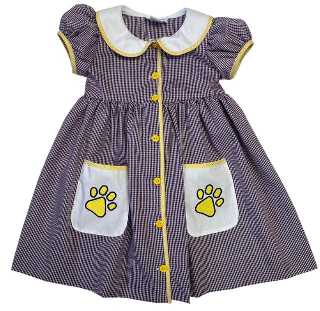 Get ready for game day with this sweet tiger print purple and gold embroidered dress with pockets! Designed with love in Louisiana.