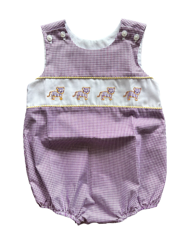 LSU Smock Purple Gingham Uni Bubble - 6M can be ordered and will be drop-shipped. In stock items typically ship wtihin 7-10 business days.