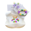 Sneak them their first taste of King Cake with our best-selling silicone teether and matching bucket bib set. A great gift for your favorite Mardi Gras baby to enjoy year round! Gift set includes: