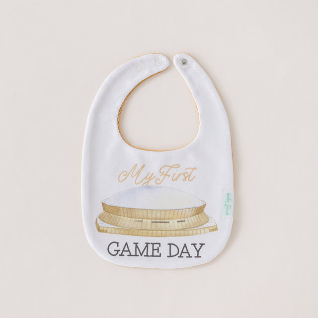 Celebrate your baby’s very first game day in true New Orleans style with our “My First Game Day” organic cotton baby bib! Featuring an iconic illustration of the Superdome on the front and a soft, absorbent gold terrycloth back, this bib is perfect for keeping little fans comfy and mess-free while showing off their black and gold spirit. Designed for game days, tailgates, and everyday wear, it’s a must-have accessory for any Who Dat family.