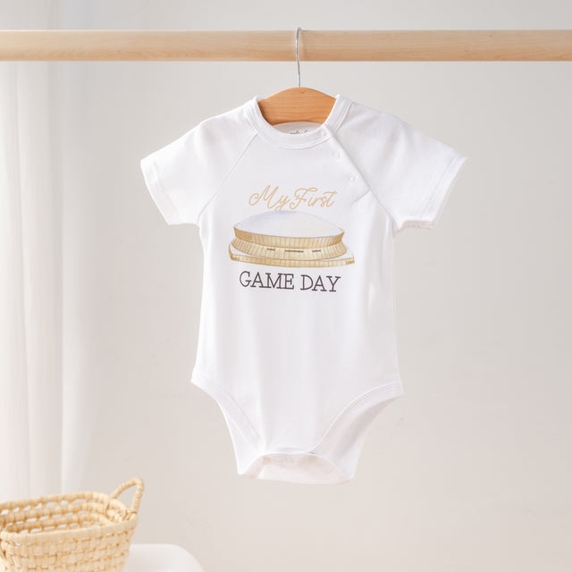My First Game Day organic cotton baby onesies are the perfect accessory for your baby to cheer on the black and gold, whether at the Dome or relaxing at home!