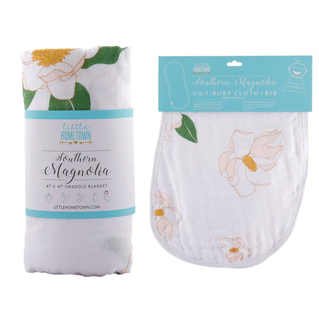 Save 10% when you order the beautiful Southern Magnolia Swaddle and Burp Cloth/Bib together as a gift set!