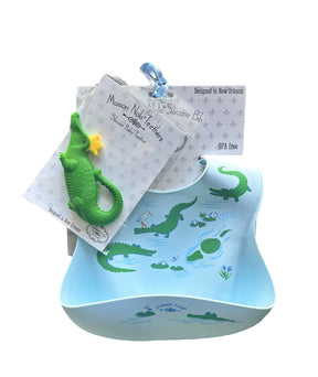 Treat your bayou baby to our best-selling silicone teether and matching bucket bib set. Gift set includes:
