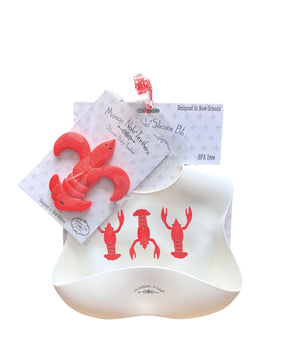 Celebrate baby's first crawfish boil with our best-selling silicone teether and matching bucket bib set. Perfect for crawfish season and year-round cuteness. Gift set includes: