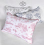 These 12” x 18” pillow will look great in the nursery. Features our 100% Cotton Storyland Toile print. Button closure on the reverse. Pillow insert included. Cover is machine washable. Perfect for your nursery chair. Choose Pink, Blue, Grey, or Natural below.