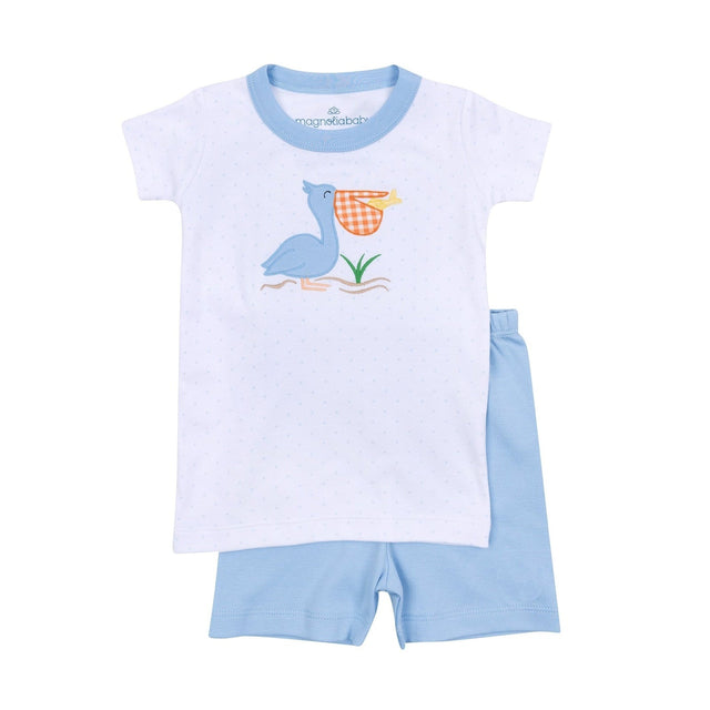 Indulge your little one with these luxurious Pima Cotton short pajamas, complete with a charming Pelican Bay pelican applique for a dash of coastal charm. Perfect for sweet summer dreams, these pajamas offer gentle comfort and a stylish look that is a must-have for your baby's sleepwear collection.