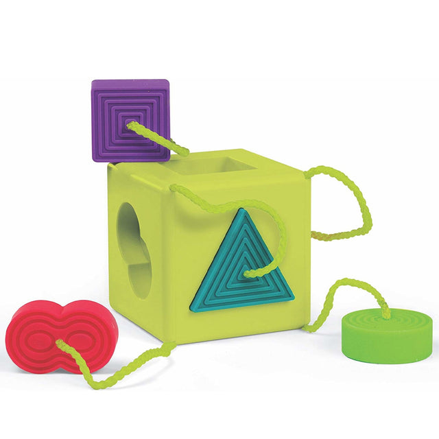- INNOVATIVE: The Oombee Cube offers a unique way to shape-sorting fun! With 6 rubbery shapes attached to it's corners, you never have to worry about losing a single shape