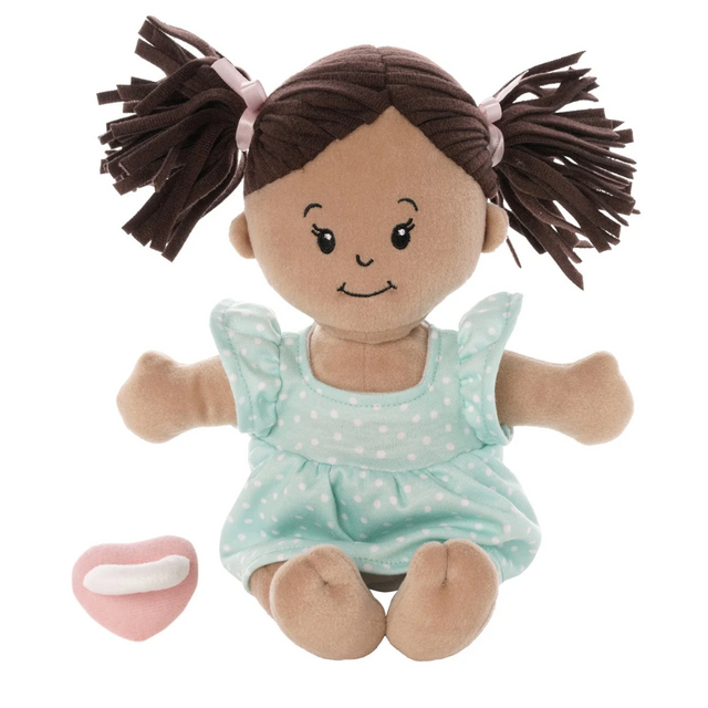 The Love, Stella dolls are the perfect size for holding, hugging, and nurturing role play to foster social and emotional development. Dolls are 100% soft with embroidered features, fabric hair, plump tummies, cute little belly buttons, and a signature magnetic pacifier design. The doll body has a weighted bottom and sits unassisted - perfect for playtime! Clothes are removable and feature hook-and-loop closures for supporting elementary dressing skills.