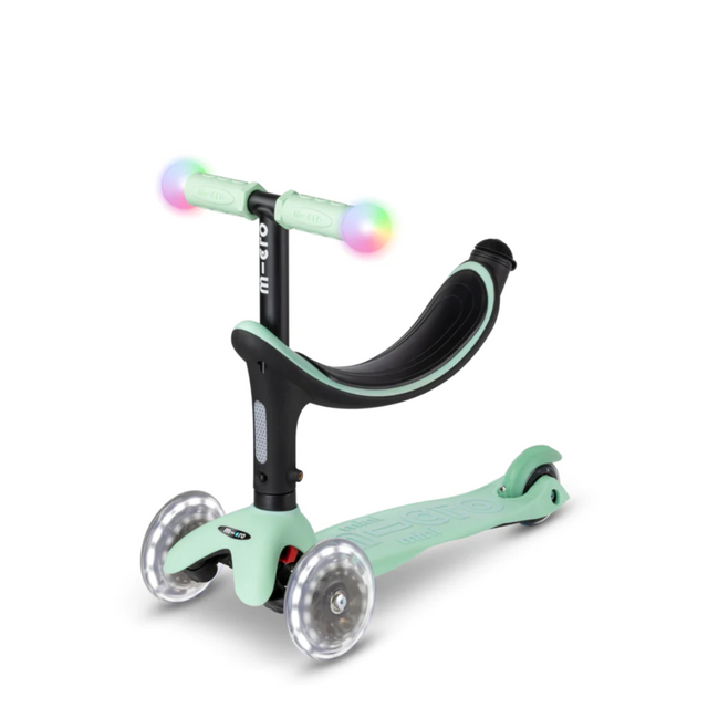 The innovative and ergonomic all-in-one scooter can be used in four different variations: at the very beginning with seat, two footrest options, and push bar for the parents; later on without the parent’s push bar, as a mix between balance bike & scooter; as a starter scooter for young riders; and finally as a classic Micro Mini Deluxe Scooter with Magic LED light bulbs on the adjustable handlebar, plus LED wheels.