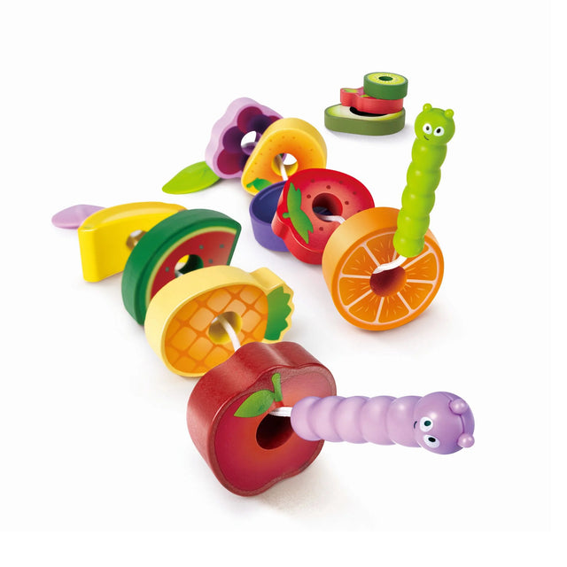 - Fruit pieces have holes in the middle so you can thread them onto the caterpillars' strings
