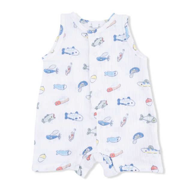 Angel Dear Fishing Lures Sleeveless Shortie Romper - 3-6M can be ordered and will be drop-shipped. In stock items typically ship wtihin 7-10 business days.