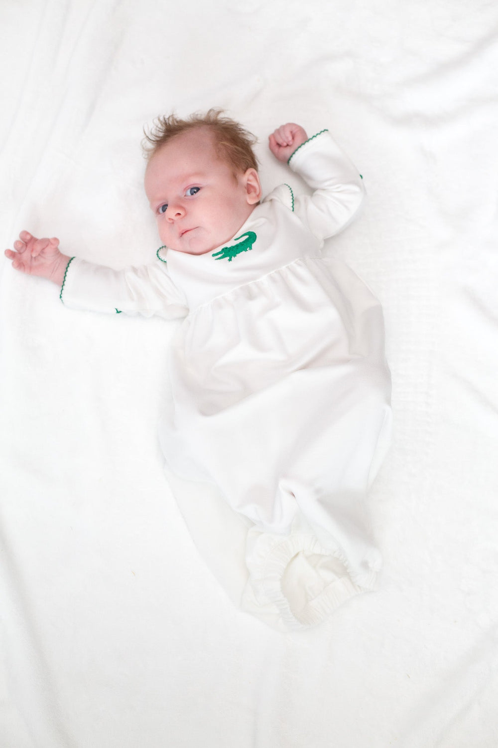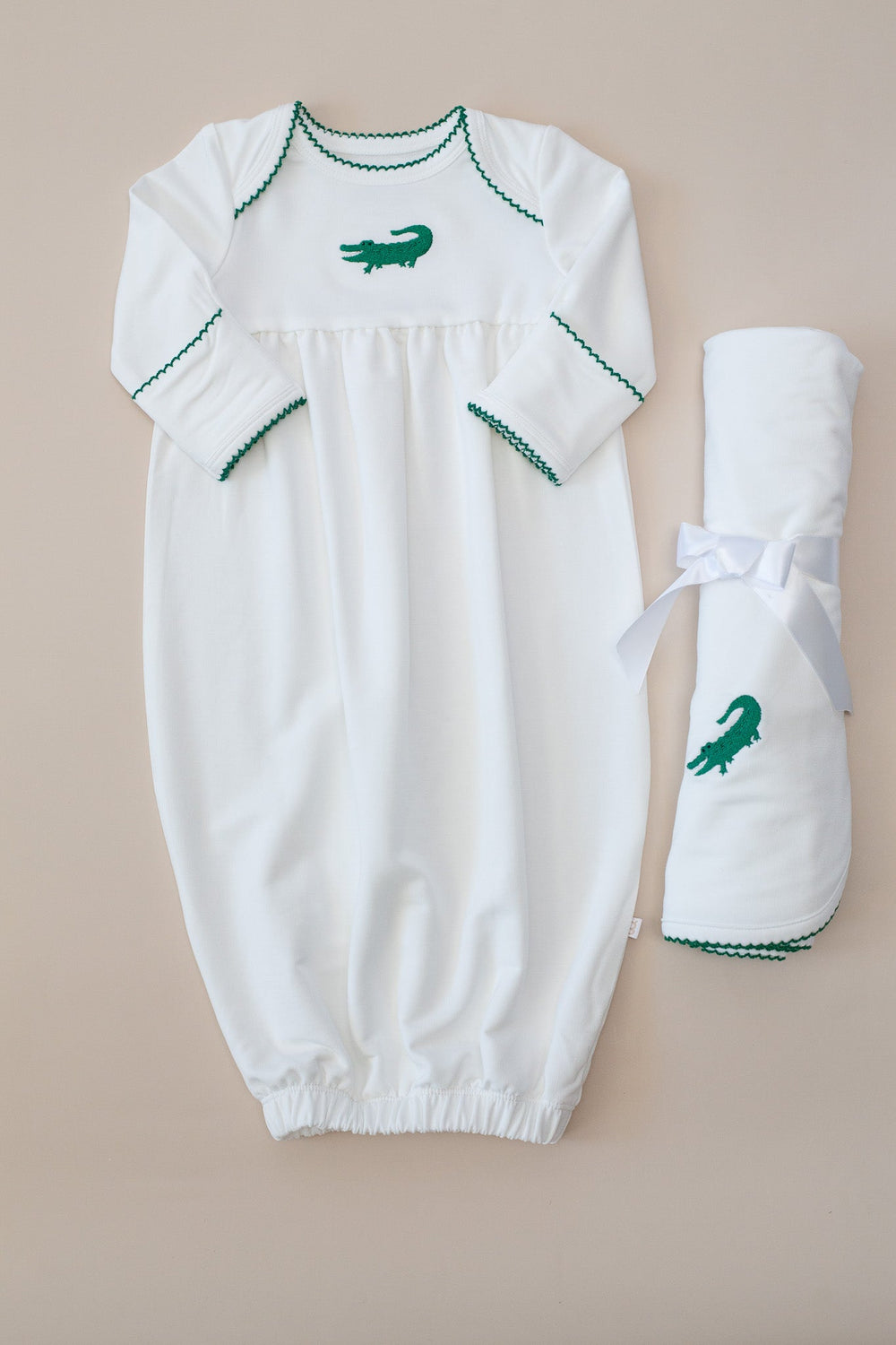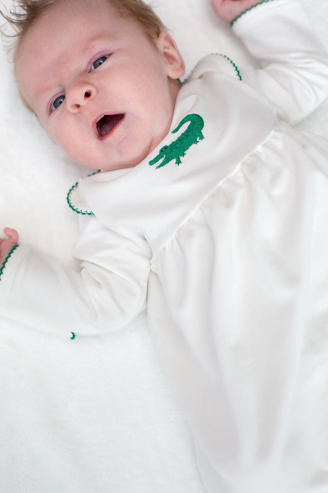 Goosies Pip Alligator Embroidered Bamboo Gown - NB can be ordered and will be drop-shipped. In stock items typically ship wtihin 7-10 business days.