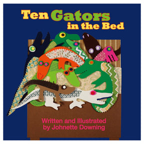 True to her Louisiana culture, Johnette Downing brings readers deep into the swamp where ten gators pile into bed in their Acadian home. Based on a familiar tune, this singing book, with vibrant foam and paper illustrations, is a perfect counting and bedtime story for babies and gators who find out who gets to sleep in the bed and who has to sleep in the swamp!