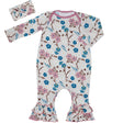 Ridiculously cute! Outfit your little lady for a day of fun and fashion in this cozy-soft, knit jersey romper with a modern floral print and 2 tiers of oversized ruffles at the ankles! A snap inseam and lap collar make dressing easy, while a matching adjustable headwrap completes the look!