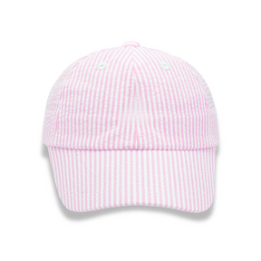 Bits & Bows Baseball Hat | Pink Seersucker - 0-2Y can be ordered and will be drop-shipped. In stock items typically ship wtihin 7-10 business days.