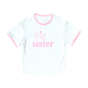 This classically cute white girls' t-shirt features soft fabric, a sweet "big sister" sentiment, and light pink collar and sleeve details for a playfully polished style perfect for celebrating that big sibling promotion!