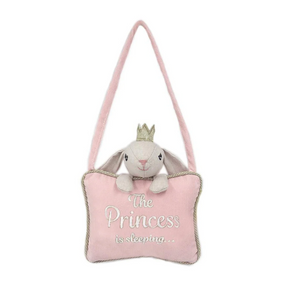 Shhh...The Princess is sleeping! This beautiful little pillow is perfect to hang on a knob, crib, or door. Made of soft pink corduroy, our signature gold fabric piping, 3D bunny and hanger loop, a must for every Princesses. bedroom. Pair as an accent to our nursery collection!